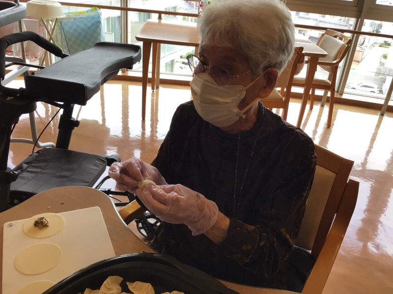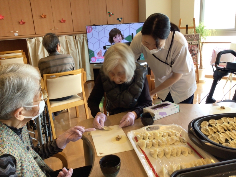 9月のフロアレクは「ギョーザ&あんかけそば」職員も利用者様もみんな大好きな食べ物ですよね。かくいう私も週に1度は食べたいと思っています。ケガに注意しながら、野菜はそのまま切ると硬いので一度ゆでて、利用者様にも野菜を切って頂いたり、ギョーザの皮を包んで頂く等、昔取った杵柄で大はしゃぎ。ギョーザは2種類作り、一つは普通のギョーザ、もう一つは、しそを巻いた「しそ巻きギョーザ」。職員も利用者様もみんなで楽しんで作ったギョーザ&あんかけそば。中華あんが大好評でした。