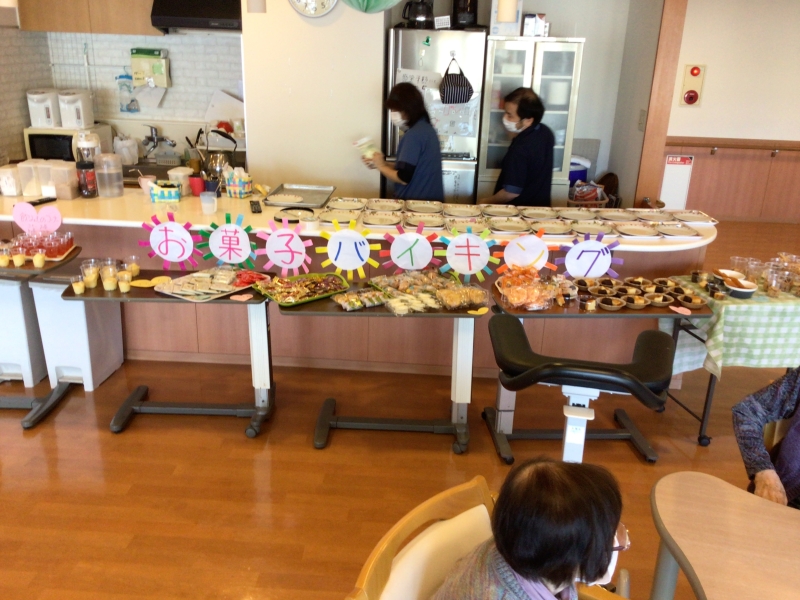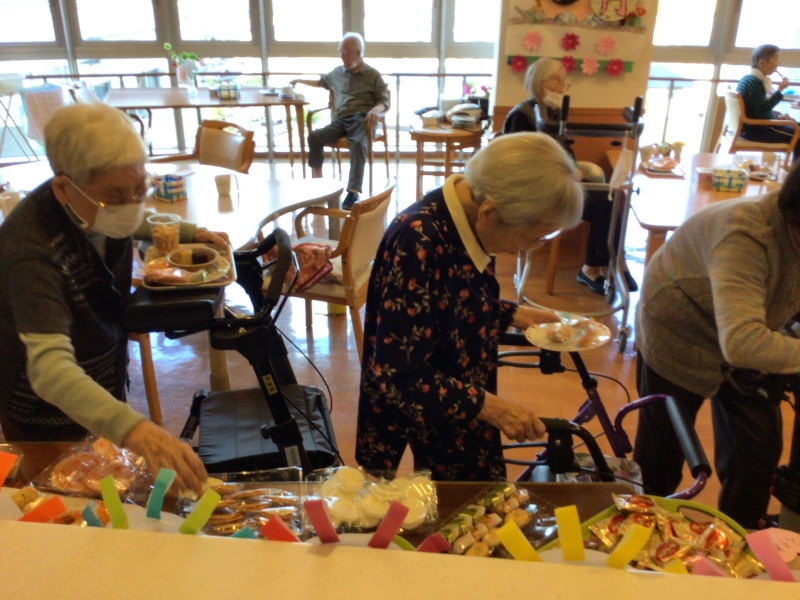 入居者の皆さんのおやつの好みはそれぞれ違いますが、この日はあれもこれもっずら~っと並べてお好きなものをどうぞ~‼と、バイキング形式で楽しんでいただきました。