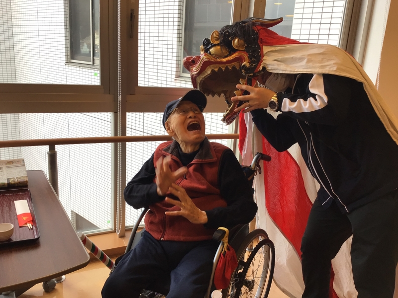 「正月」いうことで、各階で獅子舞の踊りを鑑賞やおせち料理をふるまったり、福笑いをして頂き楽しんでおられました!(^^)!