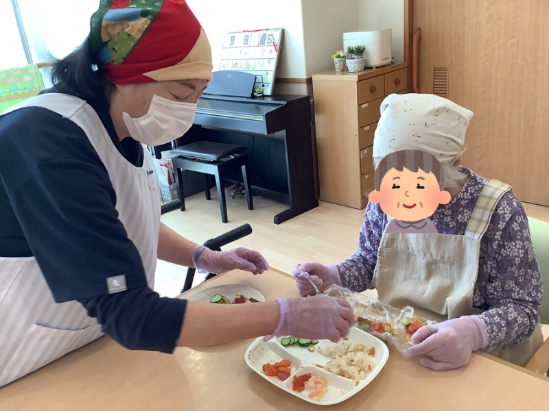 説明をしながら手まり寿司を作っていきます。 卵パックを使って丸~く出来るはず(*^^)v