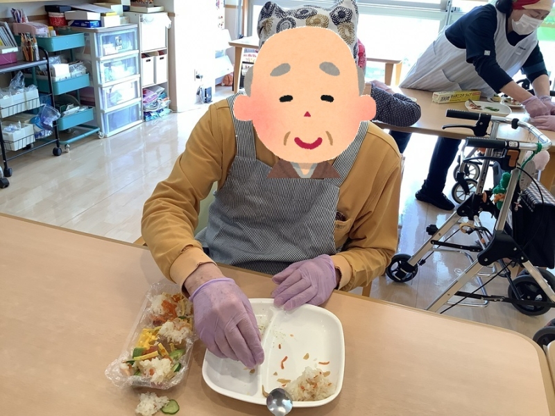具材とちらしずしをラップをかけた卵パックに順番に入れていきますね