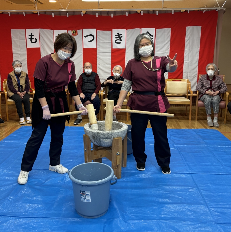 入居者様にももちをつくのをお願いしてお手伝いしていただきました。杵が重たい入居者様には職員と一緒にもちをつきました。