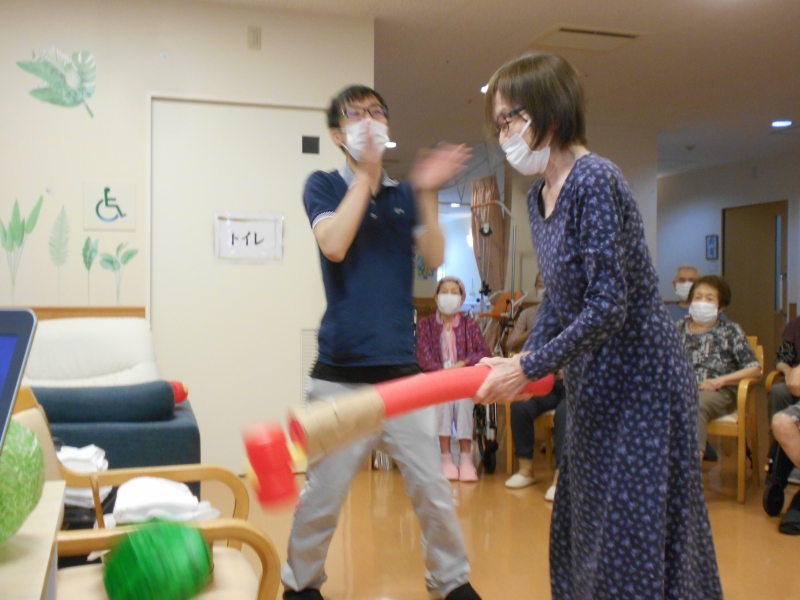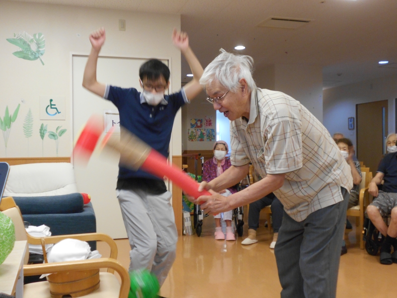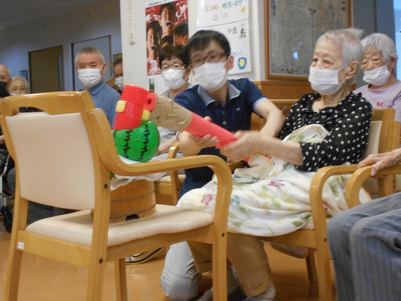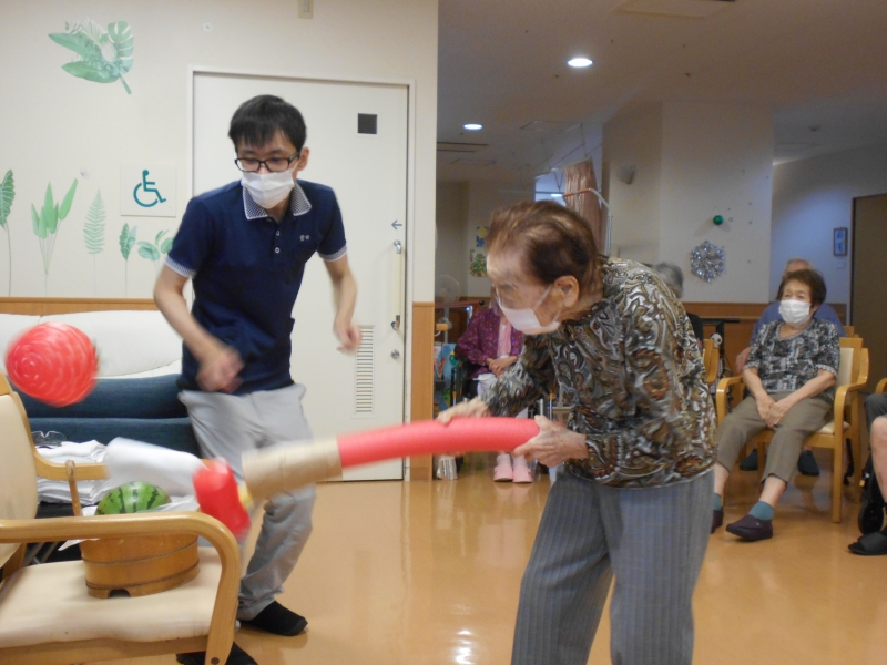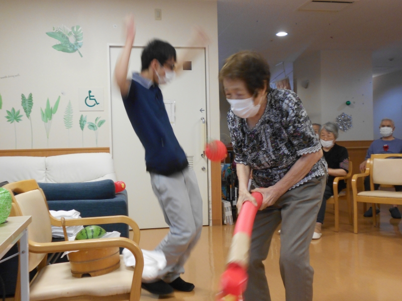 そんな時ですが、春日野園ショートでは、スイカ割りレクをやりました!