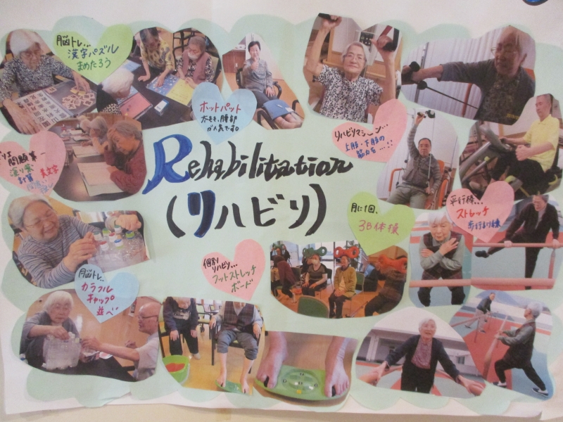 ・フットストレッチボード ・リハビリマシーン ・脳トレプリント ・漢字パズル ・まめたろう ・平行棒で歩行訓練 ・キャップ色並べ