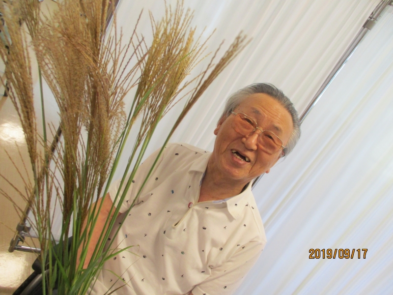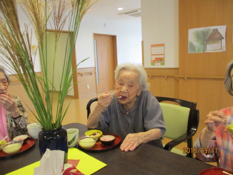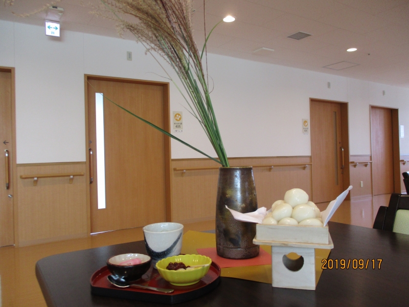 団子とススキも飾って収穫の感謝と豊作の祈りではなく、長寿・健康をみなさんで祈りました♪