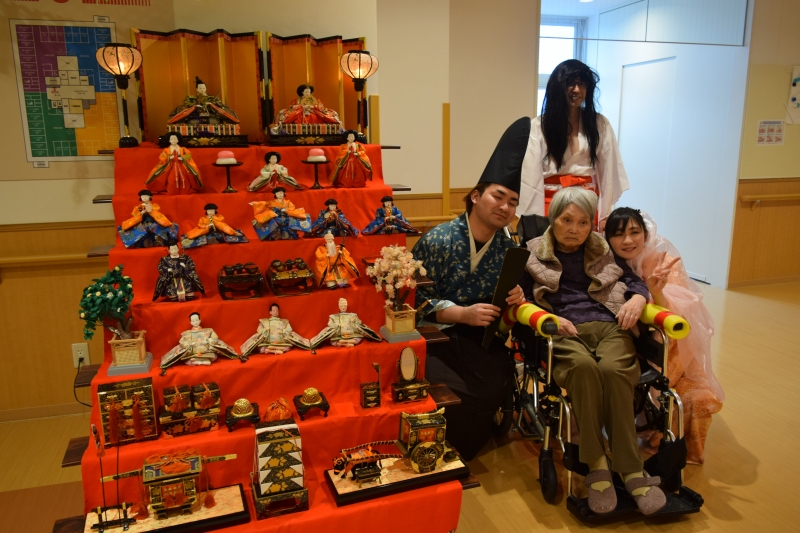 3月3日は桃の節句ということで、雛飾りを見たり、職員がお殿様とお雛様に仮装して一緒に写真を撮ったりしました。