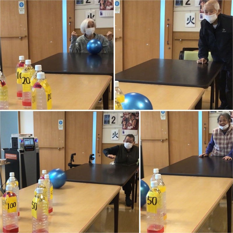 点数の書かれたピンを倒して点数を競います。高得点が出ると
