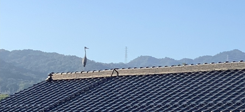 ある日の朝、天気がよいので朝食時間にアオサギくんのサプライズ!皆さんご飯を忘れて眺めていました