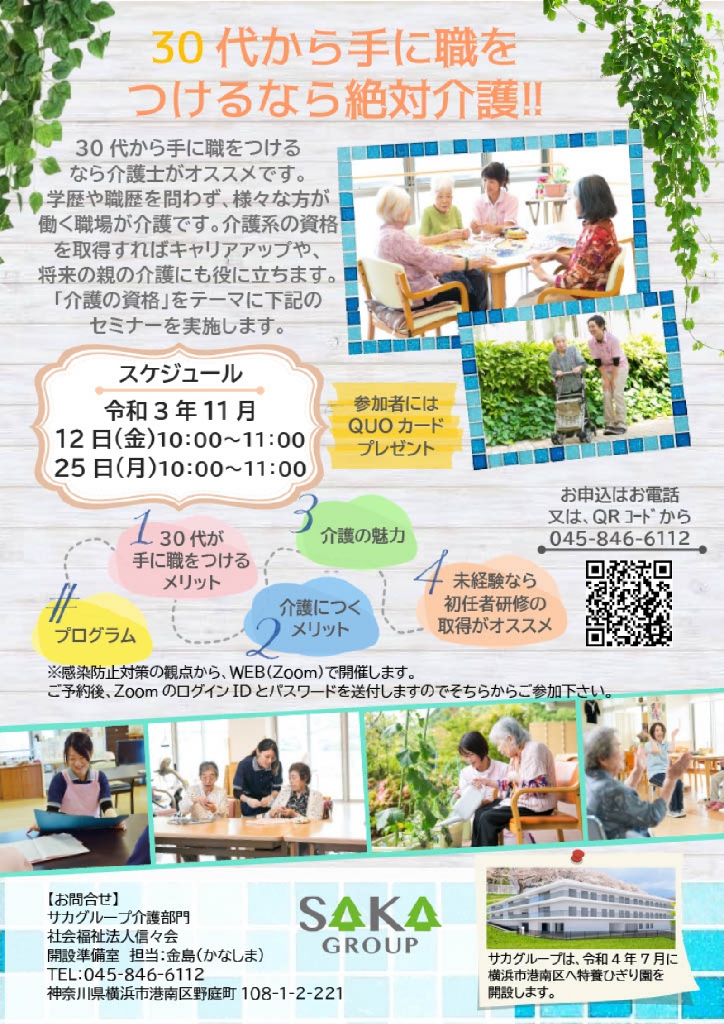 通常はサカグループで働く職員を対象に資格取得支援を行っていますが、令和4年7月に横浜市へ特養をオープンすることを記念して、下記のセミナーを受講して入職された方には、資格取得の研修費用を法人が全額負担するキャンペーンを開催しています♬