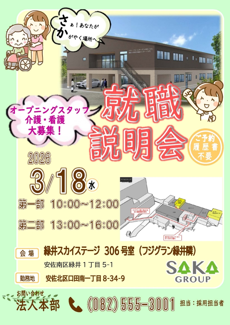 ★サカグループです★ 今夏新規開設する地域密着施設の、就職説明会のお知らせです。 3月18日(水) 場所:緑井スカイステージ 306号室 (フジグラン緑井隣) 時間:第一部 10:00~12:00 第二部 13:00~16:00 場所が少し分かりづらいので、看板を持ってスタッフがお待ちしております。 皆様のお越しをお待ちしております☺